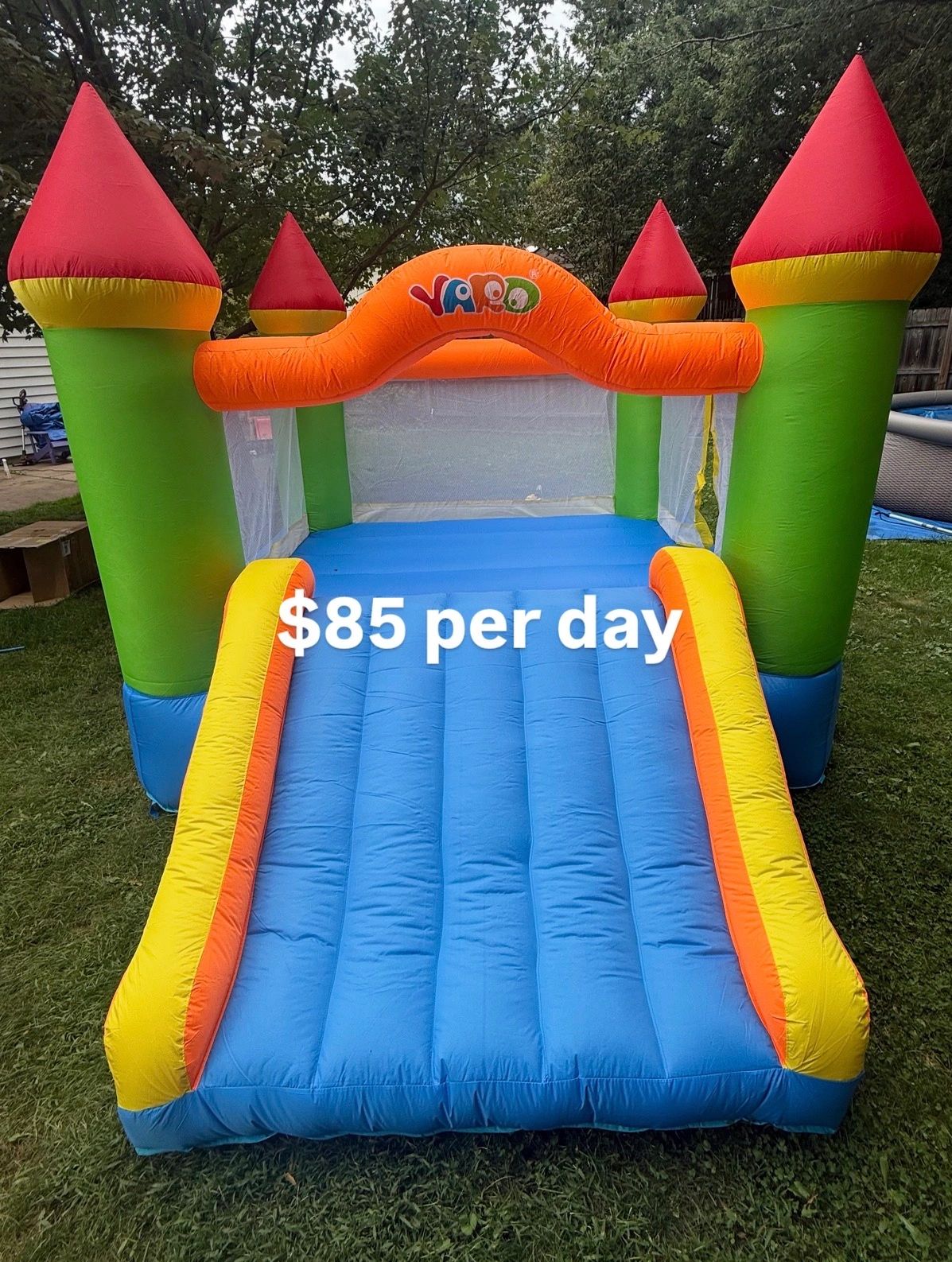 This medium-sized bounce house is a great size for the price. Younger children can bounce and will enjoy the wide slide. Comfortably holds 4-6 bouncers.