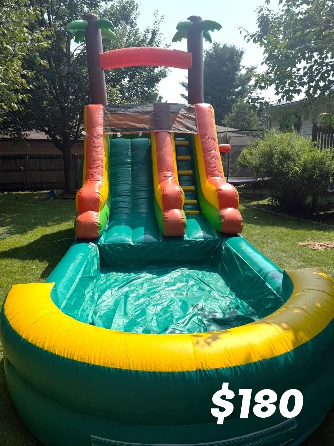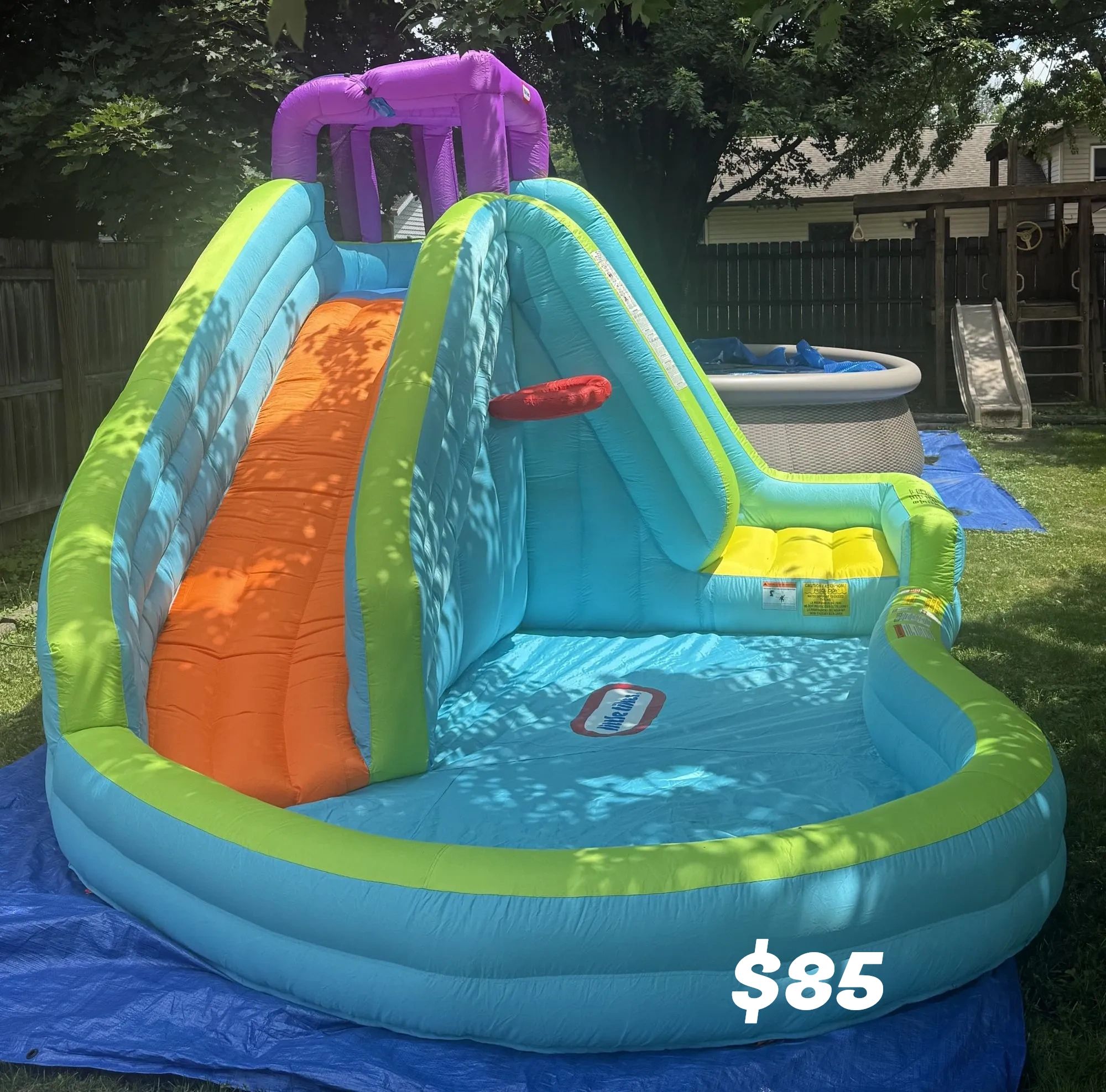 Children of all ages will enjoy summertime fun with this inflatable water park. It features two water slides, a water gun, soccer goal, basketball hoop and large pool area.